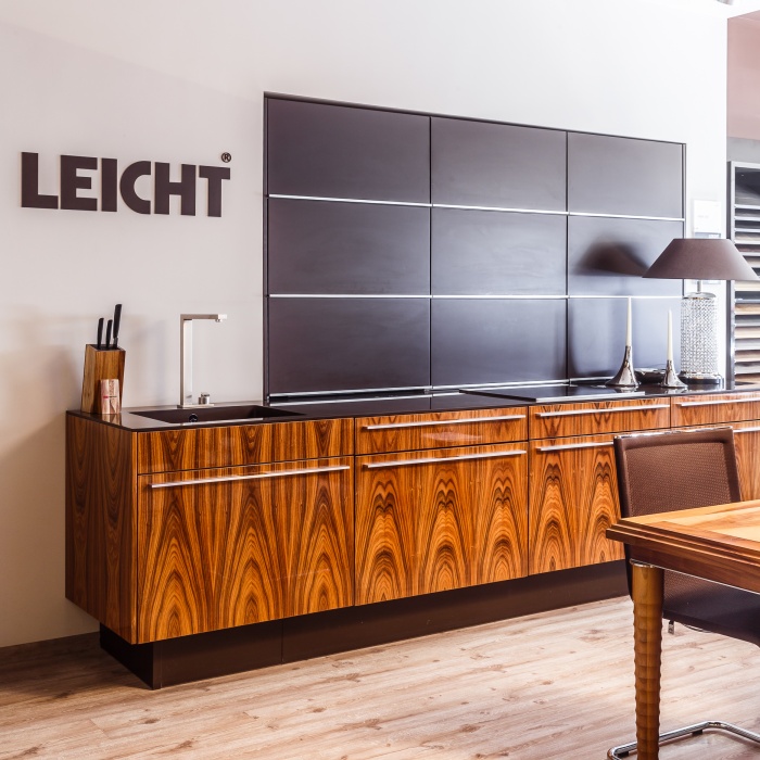 С помощью коллекции «CONCEPT 40» от LEICHT удается реализовать закрытое, уютное оформление стены, которое разбивает традиционную классификацию кухни на нижние шкафы, нишу и верхние шкафы; стена закрыта и имеет характер гостиной. Элементы шкафов высотой соответственно 40 см оснащены дверями-лифтами и дверями-клапанами, которые могут откидываться по отдельности. При открывании нижнего фасада системы «CONCEPT 40» столешница (столешница передается бесплатно) создает дополнительную рабочую зону. Функциональность и элегантный вид образуют здесь удачное сочетание. На фасадах использованы самые топовые материалы: натуральный шпон коллекции HIGHLINE, где рисунок дерева подобран вручную, матовый и многослойный высокий глянцевый лак.