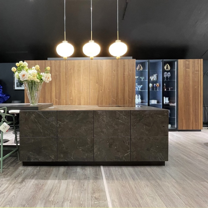 СОСТАВ ПРОЕКТА: мебельный ряд высоких шкафов с системой скрытой кухни, шкафы-витрины, керамические столешница и фартук, мойка, подстветки, вложения в выездные кассеты. В состав проектра НЕ входит встраиваемая техника.
