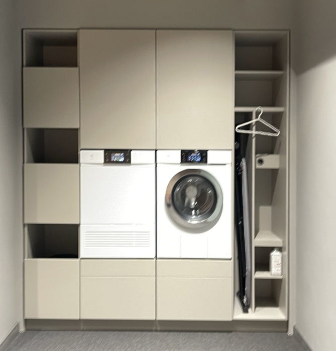Фасады выполнены из искусственного восстанавливаемого материала FENIX, цвет olivgrey. Композиция состоит из четырех секций, две центральные из которых предназначены для удобной постановки встроенных стиральной и сушильной машин на эргономичной высоте.