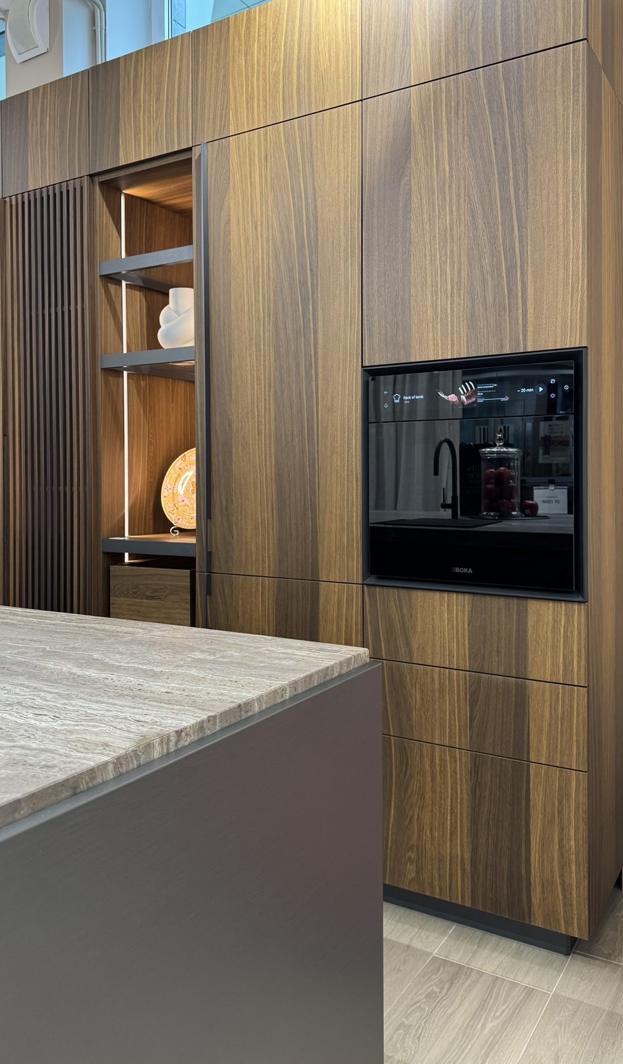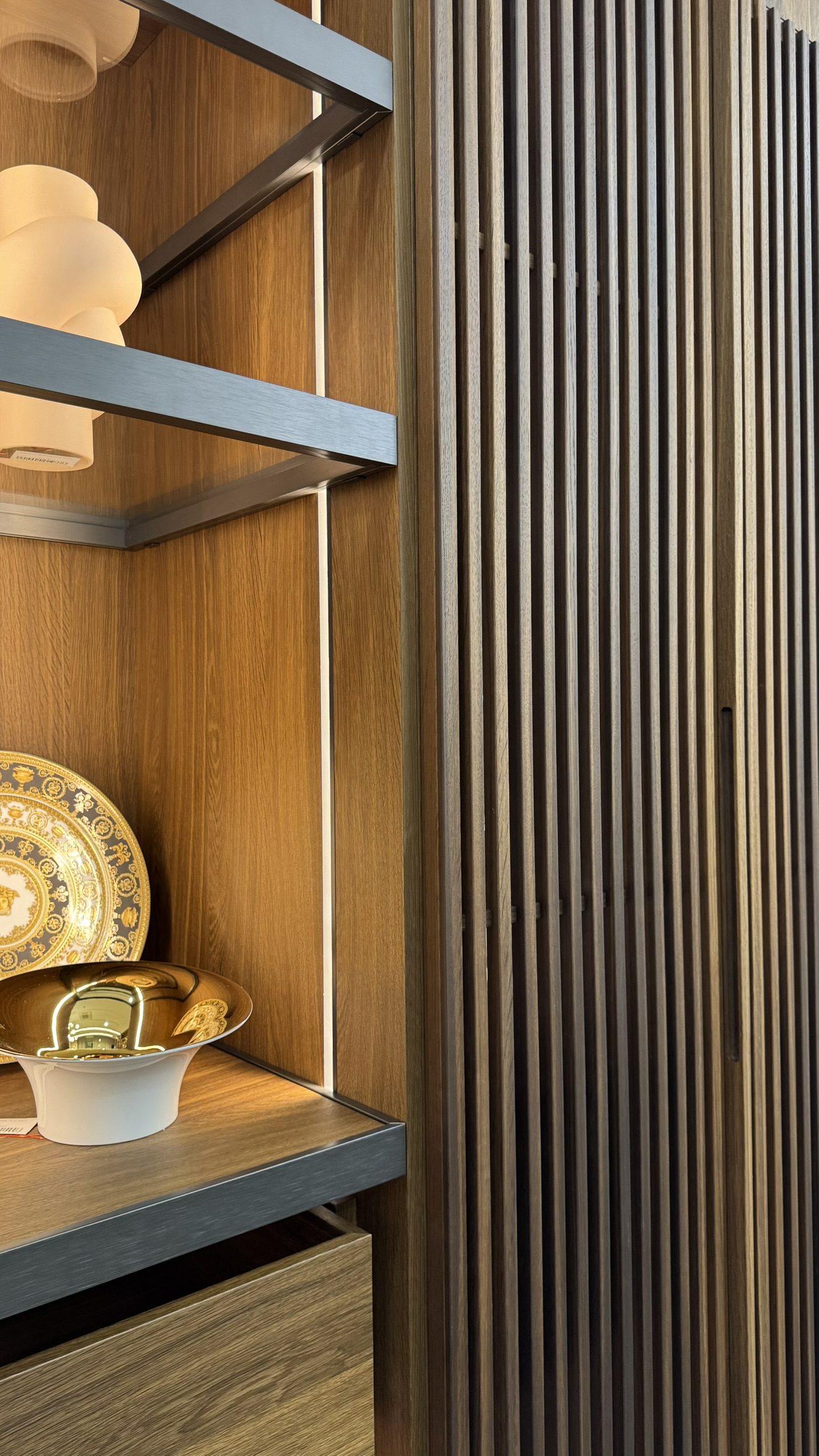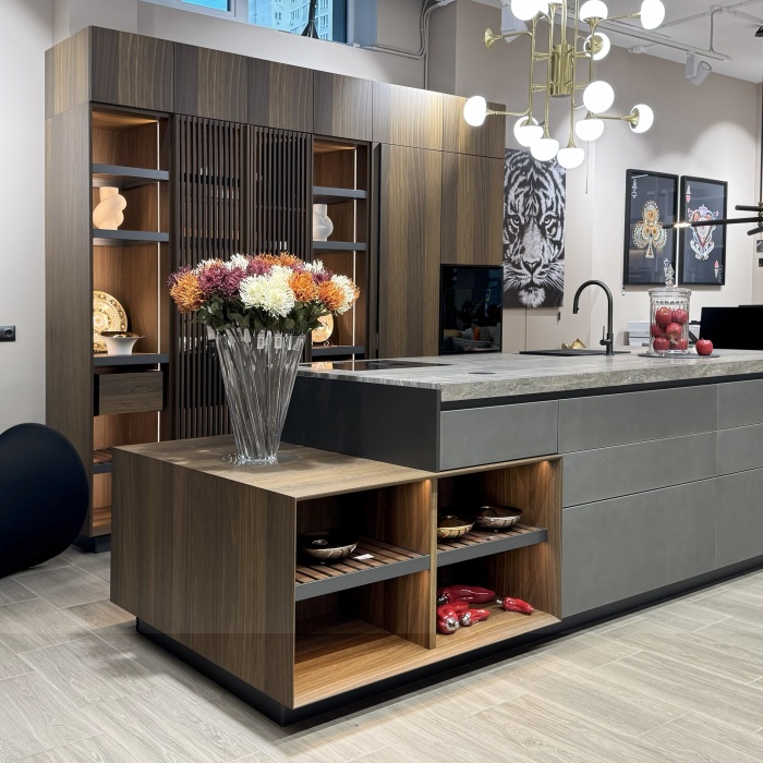 СОСТАВ ПРОЕКТА: мебельный ряд открытых и закрытых пеналов, антресоли над пеналами, встроенная подсветка, столешница из керамики и вставки из эко-кожи. В состав проекта НЕ входит встриваемая техника.